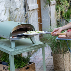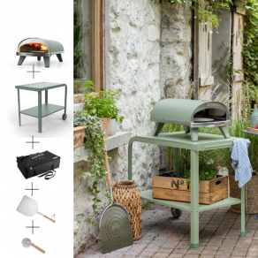 Ce pack spécial comprend un four à pizza à gaz coloris cactus + 1 desserte du même coloris + 1 housse de rangement + 1 roulette + 1 pelle à pizza!